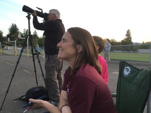 A week after watching Vaux’s Swits go down the chimney at the winery, Karen Hussey invited me to accompany her to Hedrick Middle School in Medford where thousands of swifts have roosted in a big brick chimney for many years. Karen is in charge of ‘the Swift Project’ and has done a remarkable job in alerting the community to the roosts, engaging kids and teachers at the school, and alerting the public to the hazards the birds face here during migration. Here she is, waiting for the great descent.