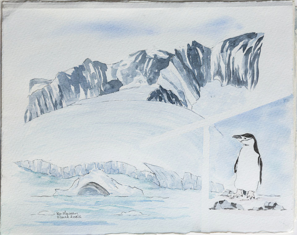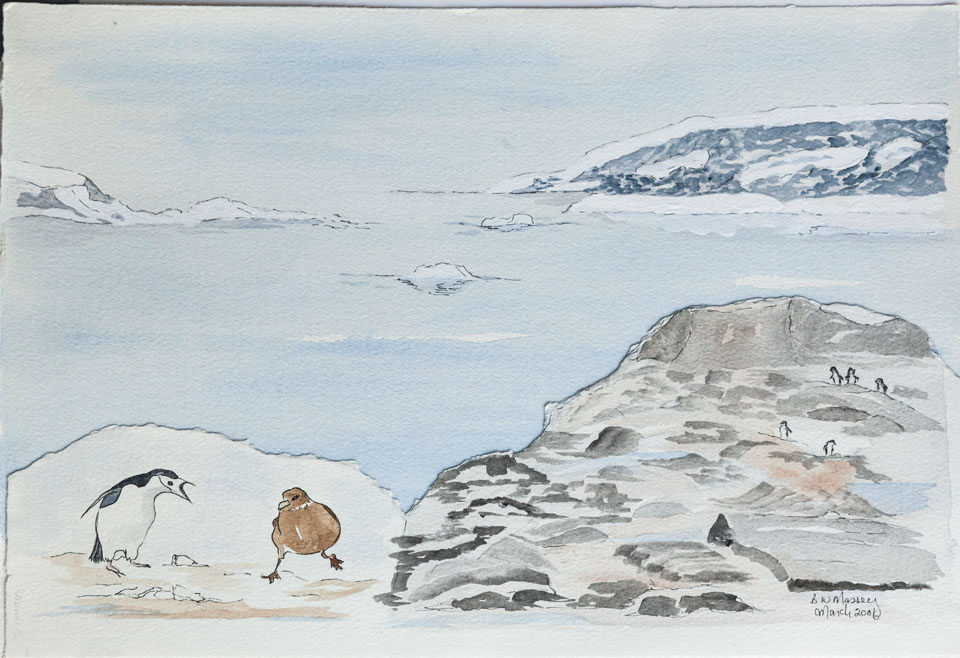 Antartica In 2003 I went to Antarctica, and its awesome beauty inspired a series of paintings. Adelies and seal Antarctic scene 1 Antarctica scene 2 Artic tern Chinstrap 1 Chinstrap 2 Chinstrap and skua Chinstrap collage Humpback 2 Humpback tail Icebergs