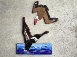 The Atlantic Puffin on the other side of the continent is very photogenic, and noted for carrying multiple fish in its bill when feeding chicks. The eyes of the fish are tiny glass beads with hollows and tinier black beds in the hollows. Not very clear in the photo. This piece hangs in my garden along with the Eared Grebe family.
